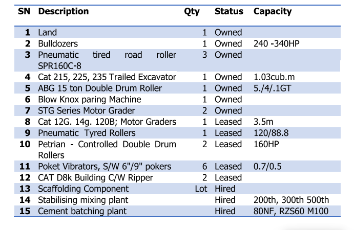 access to computers, Scanners, Printers and the Internet. The company has a signed, sealed and delivered leasing agreement with a reputable firm for equipment required for any construction and other related works in any part of